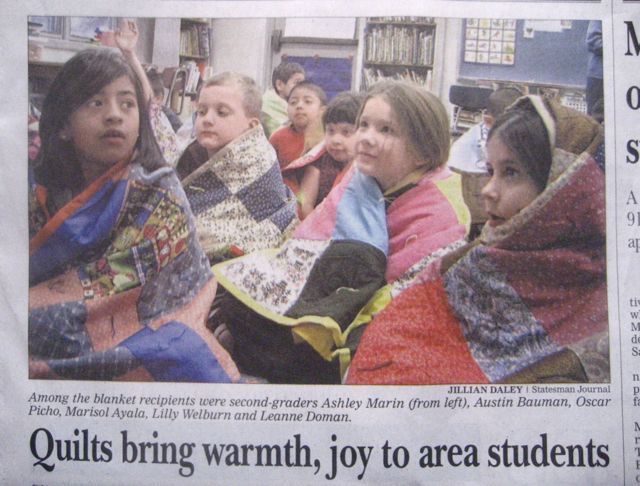and then this morning in the paper was a nice article about a women’s church group that made some 245 quilts during the course of the year for every child (and every staff member!!!) in a school where 91% of the youngsters are on federal food aid.  The kids were delighted!