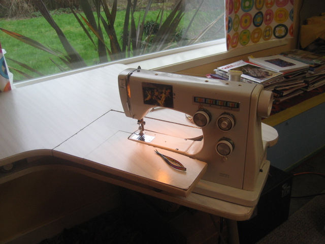 Sally arrived and the three of us went to work for the day. LeeAnn’s sewing room is in the daylight basement and is large and accommodating, with 3 sewing machines on hand…her nice new Bernina and her Grandma’s Viking (“the good kind with the all metal parts…”) and…the old Singer featherweight…