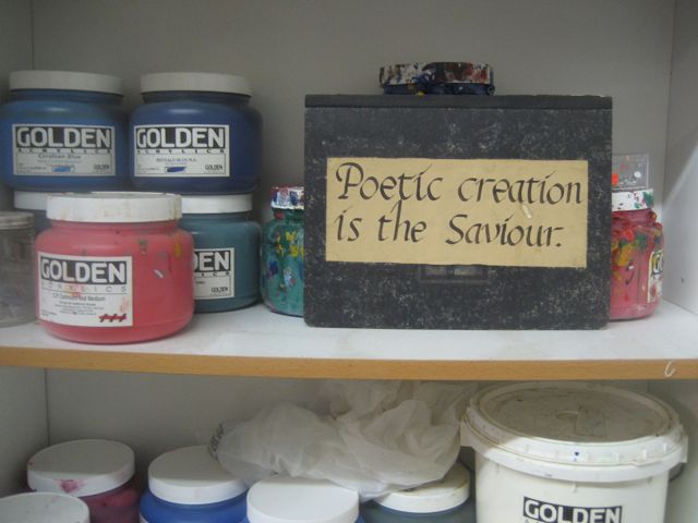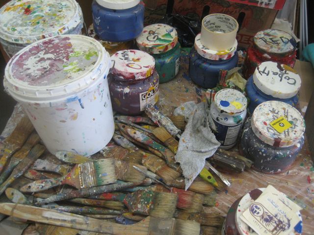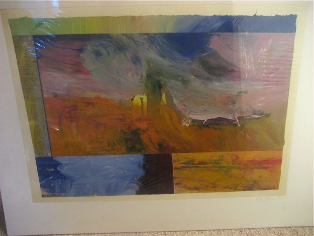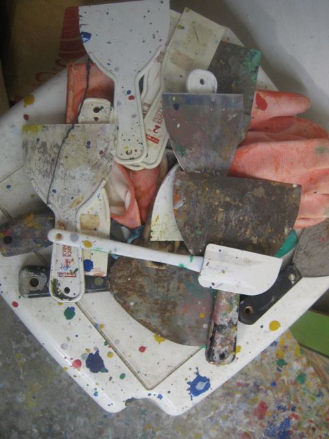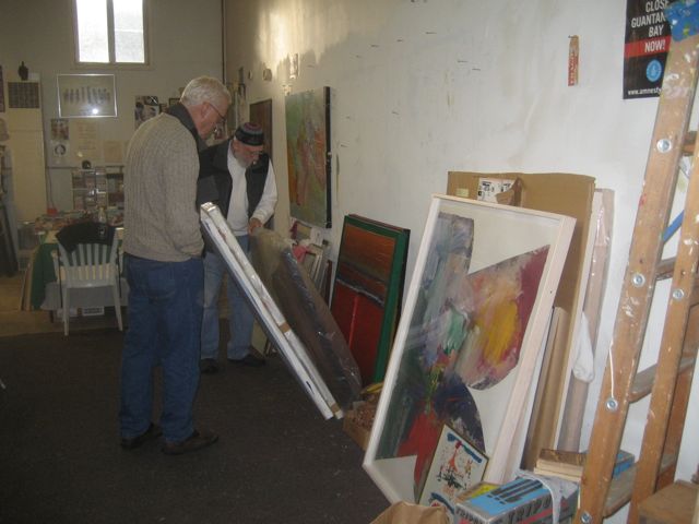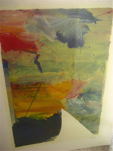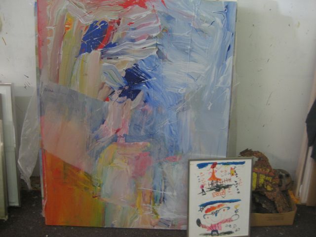 We visited the studio of Rex Amos on Monday (see previous post) and in addition to Rex’s work, we saw the work of painter Matt Glavin…studio-mate and long-time friend of Rex.  Matt (Portland/Berkeley/Cannon Beach) paints in acrylic, and for years has brought 20-24 paintings every 6 months to Magnolia Editions in Oakland, CA where they ran them through the press as part of the chine colle process.  But first the studio:
