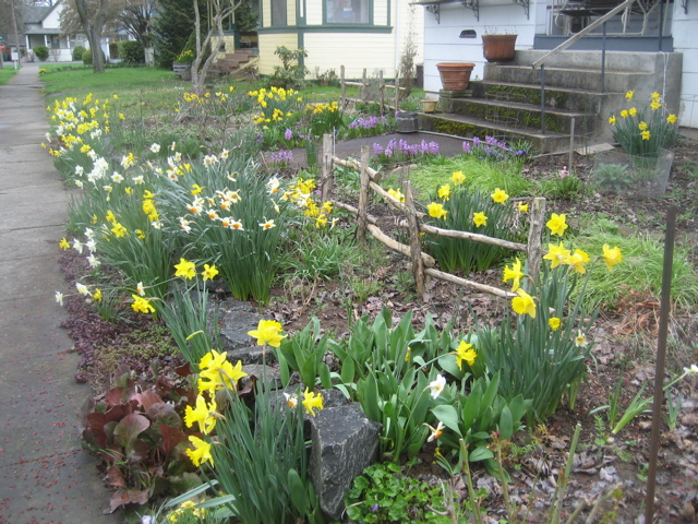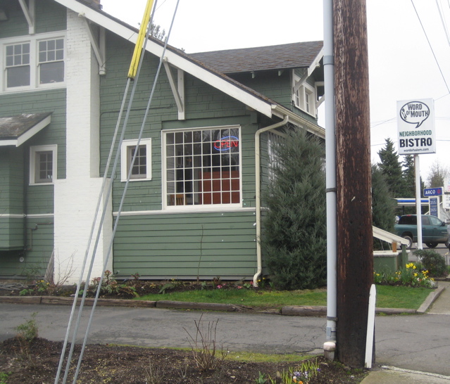 I was looking at a favorite blog yesterday (Local Ecologist) and Georgia was talking about the Winter Walk Off challenge on Les’ blog A Tidewater Gardener…start off on your own two feet, walk around your neighborhood and take some photos…of course I missed the closing date and season change (typical…) so instead of the Winter Walk Off mine became the First Day of Spring walk off. I have to say it felt more like the winter walk off though…cold and rainy. In fact the walk off was cut short by showers but it DID remind us that spring is on the way…check it out…here’s the little Word of Mouth bistro around the corner