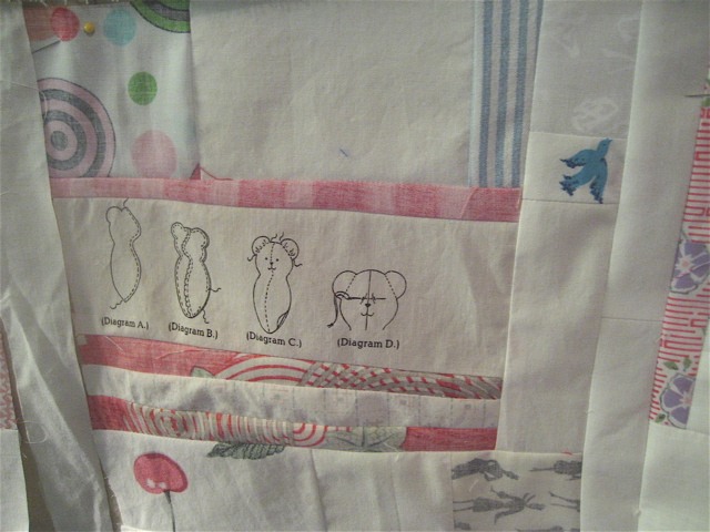 I got this piece at Value Village…a whole piece printed with the teddy bear/santa stuff. Most of the bright red squares are from the santa outfit part but then these wonderful little graphics about how to put it together…irresistible…and then the bluebirds of happiness…