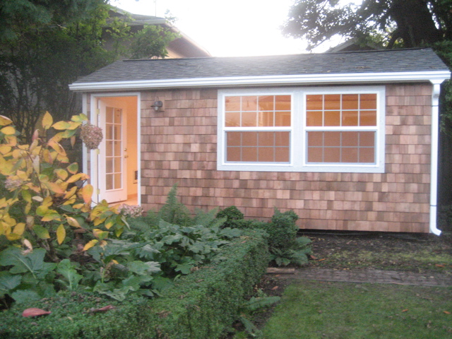 and after our EXTREMELY wet winter the bottom two sections of shingles were very dirty. Clearly action was needed, so Bill arrived last week and has been working between rain storms to make the studio surrounds as nice as the little studio itself…