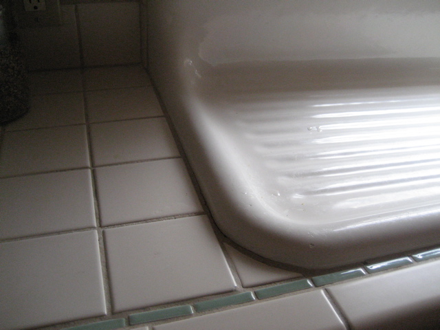 and best of all she kept the old sink in her kitchen and tiled around it.
