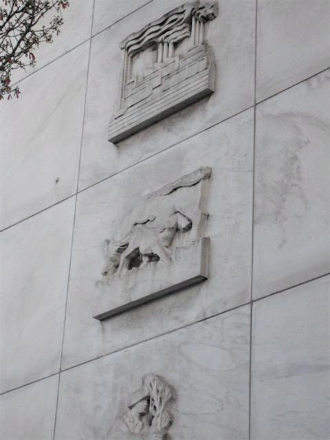 Thank you for writing about this building, I really enjoyed finding out more about it and I don’t understand why it isn’t being used. There must be some great light coming in from those north facing windows. Alex and I walked by it the other day and she said how much she liked the “paintings” on the building. She was referring not to those wonderful sculptures, but to the patterns in the dark stone walls (I want to write marble but I’m not sure what it is). Very much like some abstract paintings and I think much prettier than a few other newer downtown buildings.