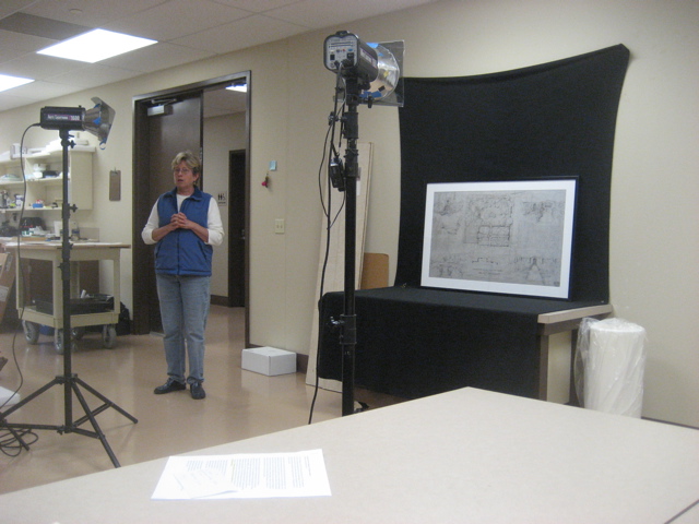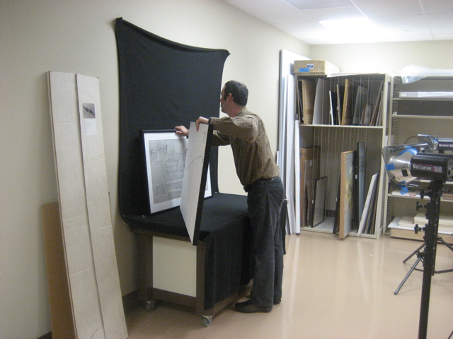 Yesterday was a busy one, beginning in the basement of the Hallie Ford Museum where the excellent Frank Miller came to photograph a few of the Lord & Schryver drawings for publicity use. Frank arrived with tons of equipment and quickly set up…ready to shoot: