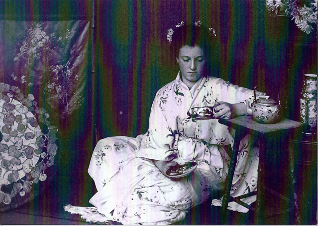I forgot to take photos of my garden tour at Irene’s beautiful garden (sometimes I forget to be a reporter)…and then the last activity of the day was a sake tasting at Bush House Museum…a thank-you party for donors. Now maybe tasting sake in a Victorian house sounds odd, but actually there was quite an interest in things Japanese at the turn of the 20th century. Here’s a photo made in Salem by Sally Bush (who lived her life in Bush House) from about 1910 which substatiates her interests in things Japanese