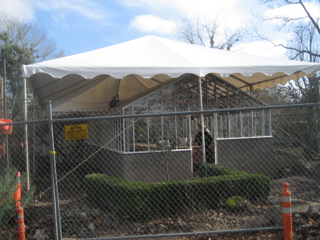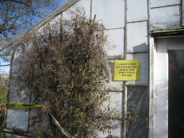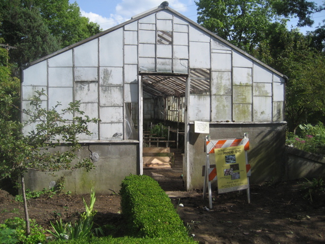 FOBG began raising funds for this current restoration project and with the help of public and private donors was able to raise the $222,000 needed to restore this historic structure. Here’s the conservatory during the restoration process