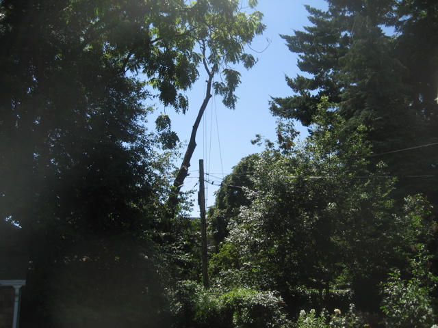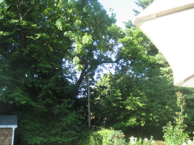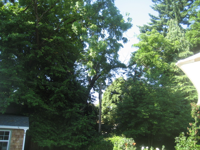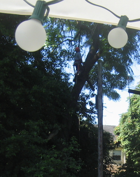 So the very next morning after Alisa’s dinner I heard the now-all-too-familiar sound of chain saws buzzing. I ran out to the deck only to discover a guy in the 40 foot tall walnut tree in the yard behind us. I quickly snapped a picture of the tree before he got started…