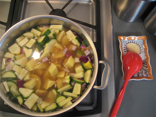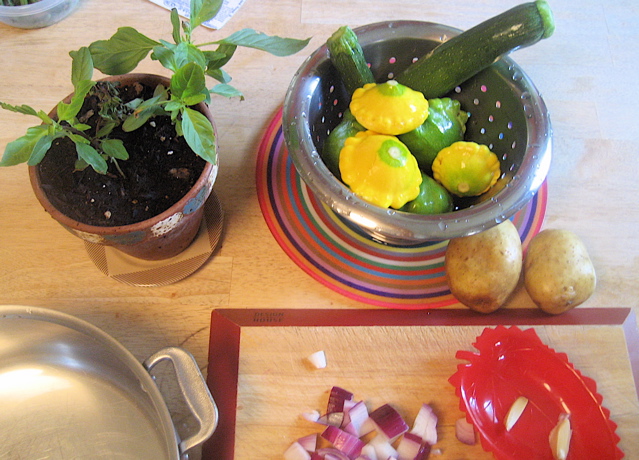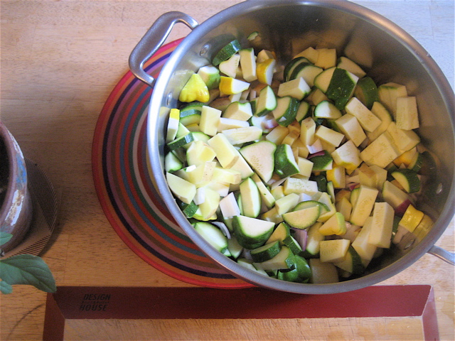 Coarsely chop 2# summer squash, 1/2 onion, and 2 cloves of garlic.  Add a potato or two if you want a thicker soup (I did…)