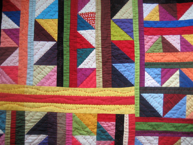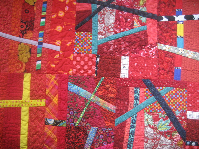 Kate Speckman and I are curating a show of quilts at Bush Barn Art Center opening September 9th (“Bits and Pieces: Intuitive Quilting from the Pacific Northwest”, which will feature three quilts by the Gee’s Bend Quilt Collective, quilts by 5 invited quilters, and quilts by 6 juried entrants.  To that end I’ve begun rounding up some of the “invitational quilts.”  We went up to Seattle this weekend and picked up quilts from LeeAnn (LeeAnn Ericksen Decker) and Sally (Dorothy LeBoeuf).  They are gorgeous: