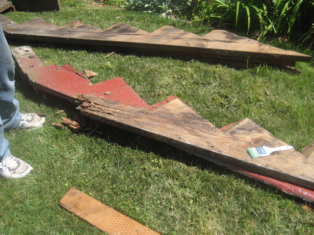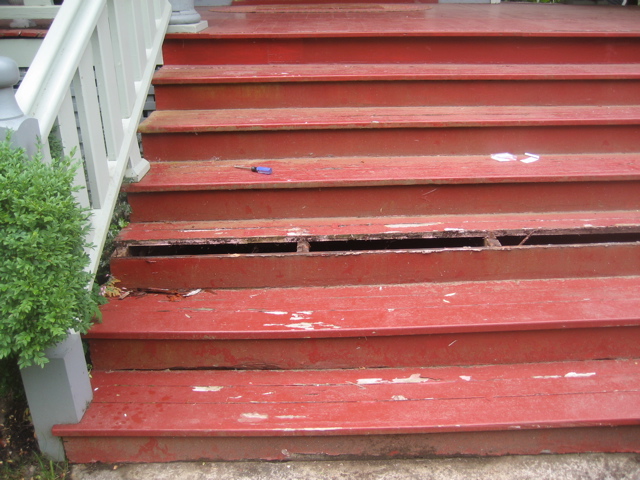 When our house was moved about 1914 to it’s current location, a new porch…sort of a colonial revival porch (having NOTHING to do with the 1849 house)…was built. Part of the decking was replaced in the 1970’s, but by August 2011, things had gone from bad to worse…take a look: