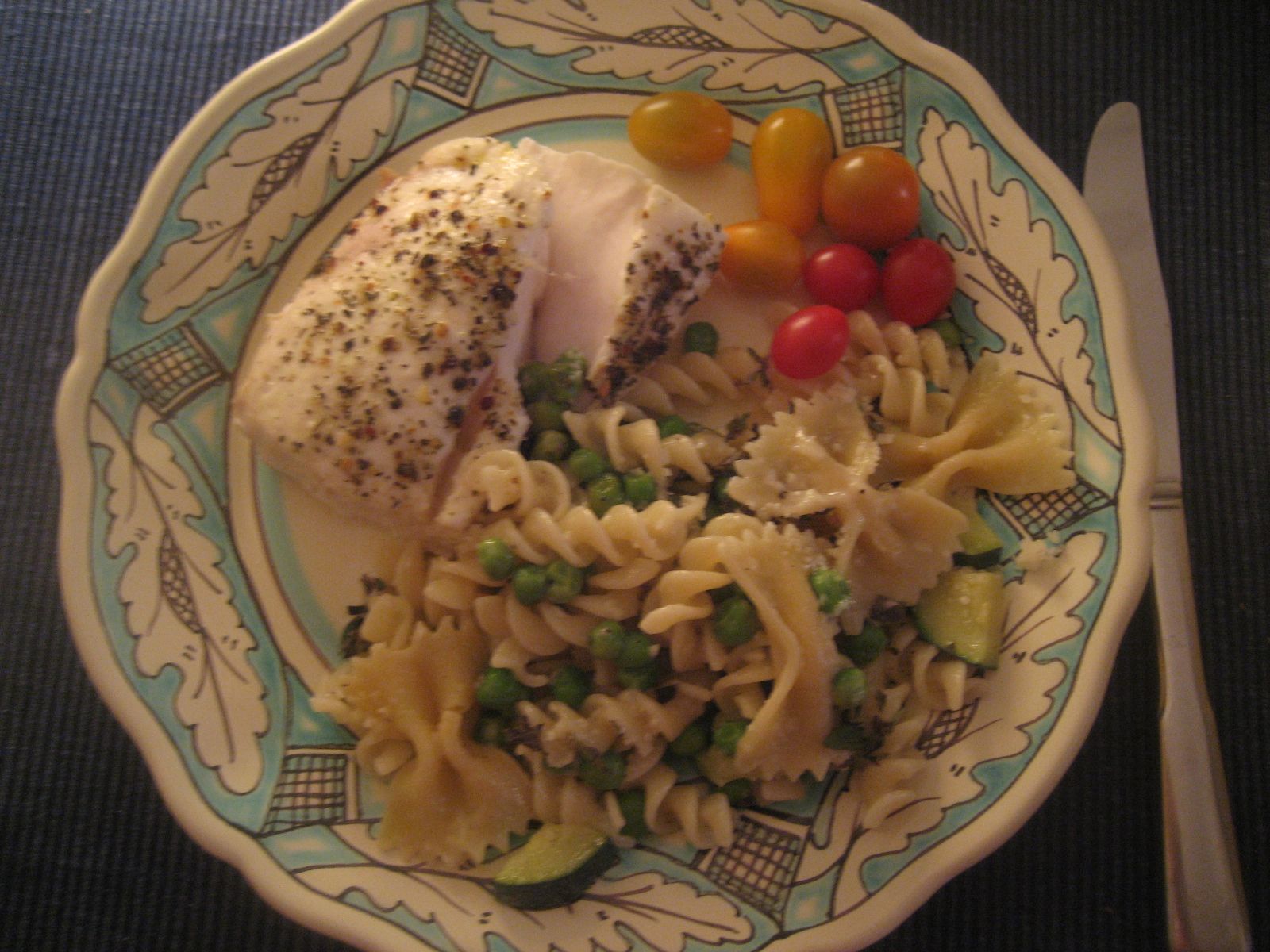 I settled for panchetta, garlic, dry white wine sauce on whole wheat spiral pasta, topped with parmesan – plus a plate of sliced tomatoes and cucumber/onion pickles. Still wish I’d had lemons and fresh basil on hand.
