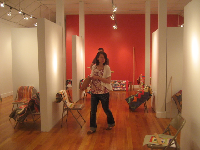 and here’s the end wall where we’ll feature “Confetti” by Sujata Shah and “Dahlia Rag” by Andrea Balosky and one other…this is Tatyana Drofyak, the talented exhibit designer, working out the final layout…