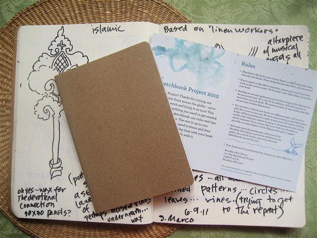 and there are rules…the most important one being that the book has to be filled and postmarked to the Brooklyn Art Library by January 31, 2012. You also have to choose a “topic” and mine is “in 10 minutes”…though they say you don’t have to stick to it…but I want to. People collage and paint and sew and cut and paste…one of the rules is that book can’t be more than an inch thick, and everything hanging out will be cut off. Librarians don’t like stuff hanging out. I’m sticking to just my pen…think I can make it nice enough.