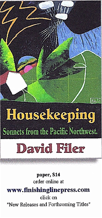 NOTE on “HOUSEKEEPING”: David Filer contacted me yesterday to say that Finishing Line Press only publishes when it has 55 orders for a book. Should you wish a copy of a book of poems by a Portland author (cover art by a Salem artist…ahem) you can order on line. An interesting sidelight is that all proceeds of sales go to The Imani Project…an AIDS relief program in Kenya run by David Filer’s wife Marlene Anderson.