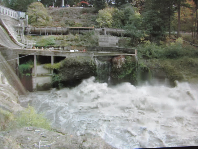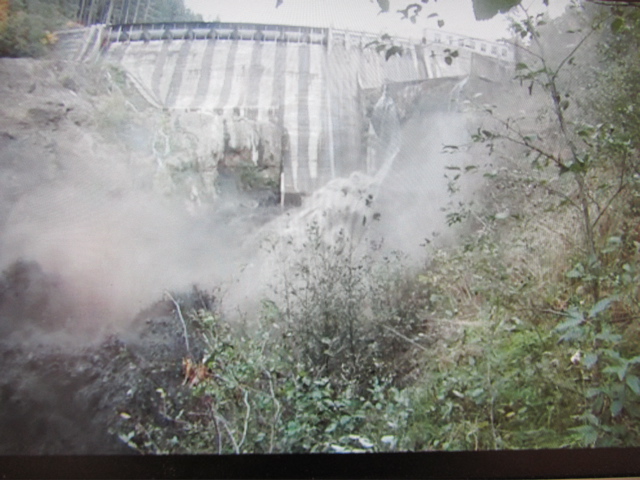 Back in August we visited the site of the Condit Dam and reported in on the fact that it was soon to be blown up and the river returned to it’s natural aspect. Well…today was the day. 11:30…BOOM. I couldn’t be there of course, but Jennifer thoughtfully provided me with a live stream link and I noticed I could take photos off the link so here goes (with a reminder that clicking on any photo will enlarge it for you):