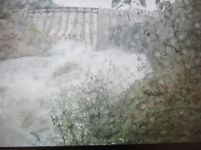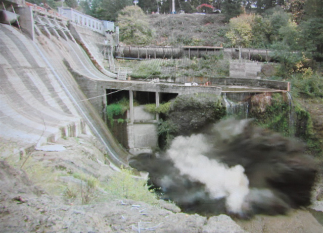 view from the side including the moment the explosives blew a hole in the bottom of the dam and the water started rushing: