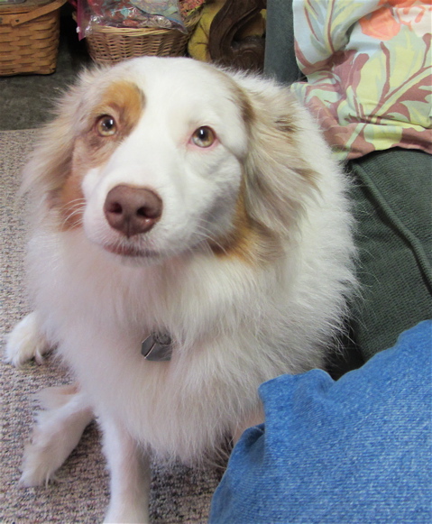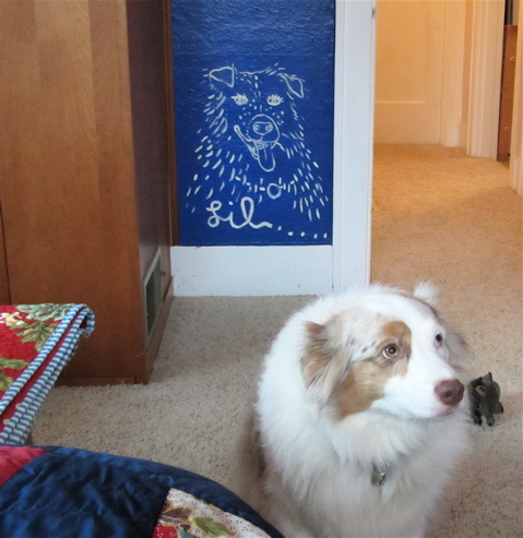 Years ago I painted the picture of the first Australian shepherd in this household, Lil, on Sam’s wall when Sam was a little boy. Sam moved into his own apartment this weekend and Lil has gone, but Malti was there to keep us company…