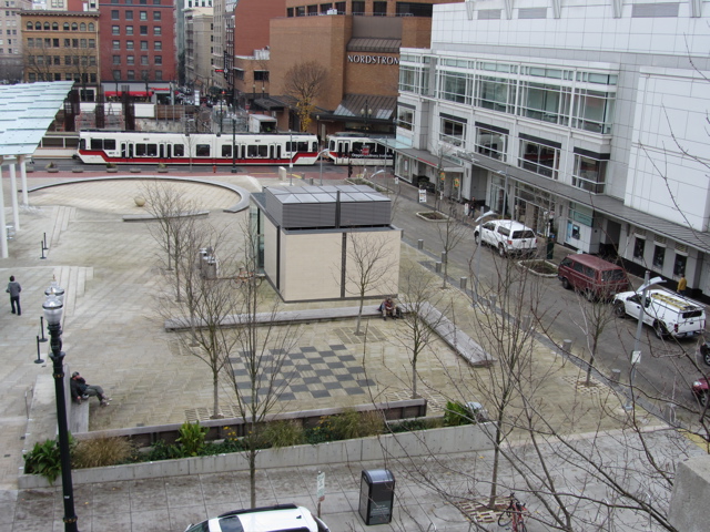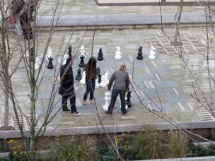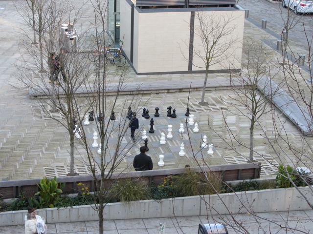 then a gallery opening (camera failure) and dinner, finally arriving at the nice Paramount Hotel with our view of Director Park (named for Arlene Schnitzer’s parents Simon and Helen Director). It wasn’t until the next morning we noticed the chess board…
