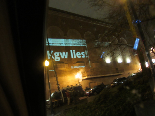 before heading out to the Blackfish Christmas party…BUT, it turned out, Occupy had “taken” the park blocks, cops everywhere, bikes with demonstrators careening around, chanting, slides on the side of the building…wow…exciting….