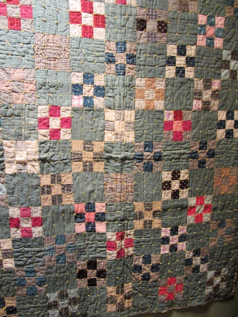 Here’s an Applegate family tied quilt with fabrics from many wedding dresses, including the teal/turquoise fabric…our guide stated that white wedding dresses came in after 1900…