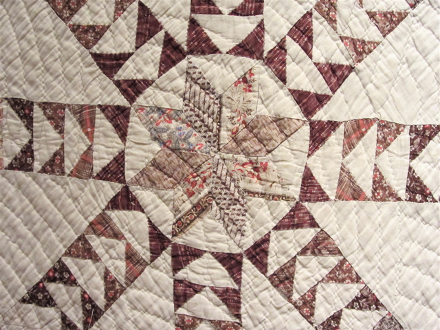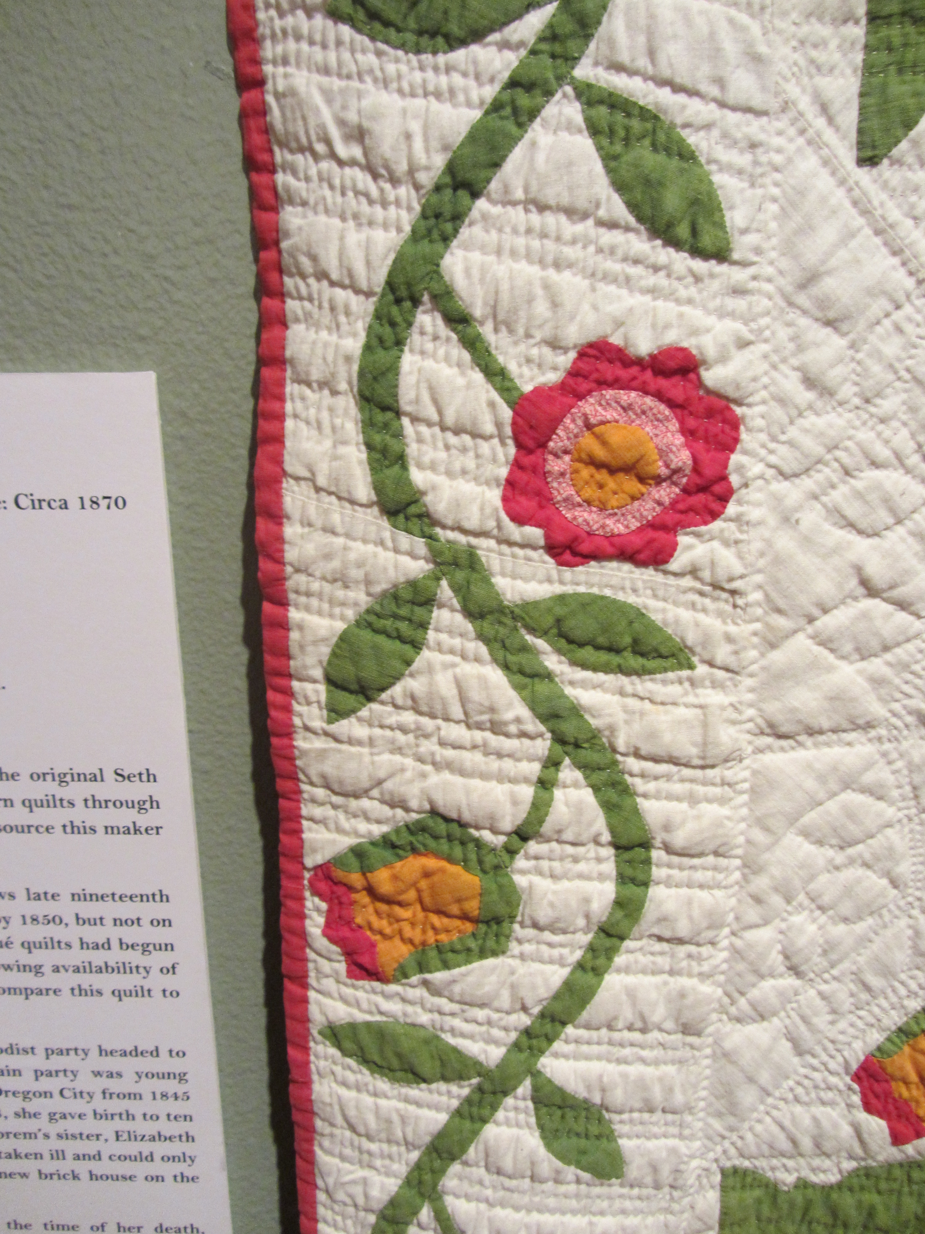 at the Willamette Heritage Center to walk through the nice show of heritage quilts curated by quilt historian Mary Bywater Cross…up until December 24th, one in a series of shows focusing on valley women.  Most of the quilts were completed AFTER the Oregon trail years, though several were thought to have been pieced on wagon trains in the 1850’s.  All the makers were pioneers or women important in the State’s history.  It’s a small show, but the karma is strong…especially for those of us who’ve sat piecing or quilting, with a quilt on our laps.