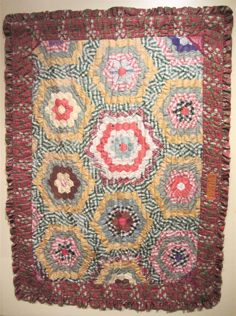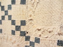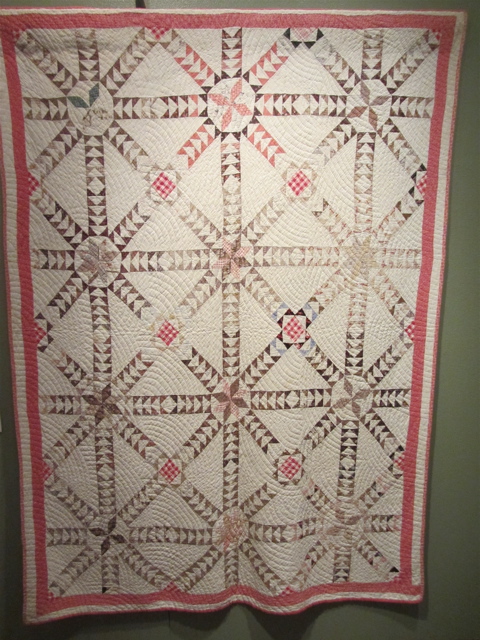 The quilts were arranged chronologically, and these gentle and faded ones still show a virtuosity of handwork, even though badly worn…