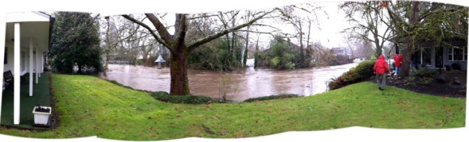 Seattle is snowed in but down here in the Willamette Valley we are in a flood. I went out at noon to check a neighbor’s house who is on vacation, and saw that Mill Creek is flooding…