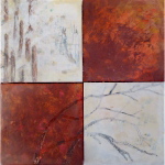 I’ve had a piece in most of these 10 shows, and it’s always fun. This year artists were paired randomly and asked to communicate with each other and find a foothold in that communication to build a small piece. My “penpal” sent a list of the alphabet with all the words filled in except the letter F…so naturally (being more than a little contrary) I did not take the 25 ideas she gave me, but chose the blank word to fill in my own idea…hence the title “The F Word.” I’ve been thinking about forests and fires a lot this year, hence my idea was formed…the piece is collage, acrylic and wax on panel, and is four- 6″ squares (which could be arranged in a line, or anyway at all). Here’s how I’ve arranged them: