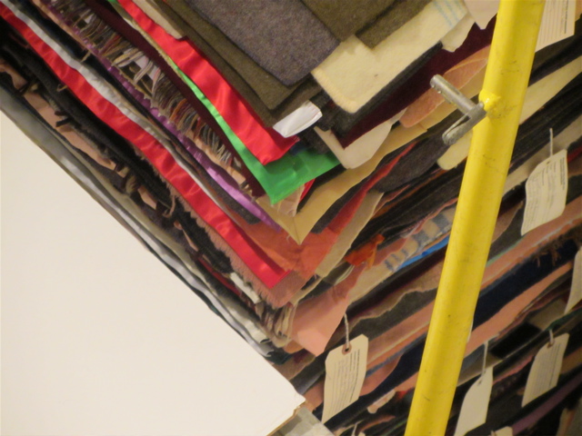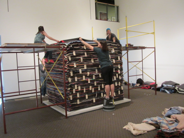 By Friday afternoon the stack is 800 blankets tall…and Angela said they are aiming for 988 and finishing by the end of the work day today! The scaffolds are now in use to reach the top of the pile, and everyone is working in stocking feet…take a look: