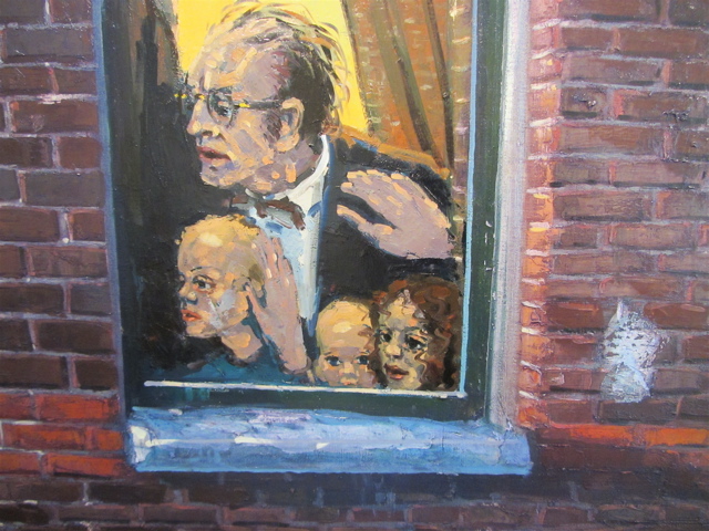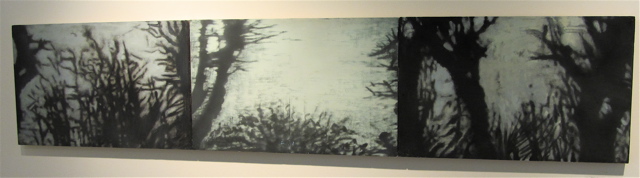 A sunny Saturday found us in Portland to see several shows and a couple of our favorite artists. We drove straight to the new home of the Jewish Museum where there is a really lovely show of paintings by Henk Pander and mixed media pieces by former Oregon artist (now NYC artist) Esther Podemski. I urge you to see this terrific little show which has film clips, and a set of sounds that enhances the horrifying and beautiful subject matter. Podemski was the child of parents who escaped the Nazi death camps, and Pander grew up in the Netherlands during the German occupation. These works remind us of the immediacy of hideous acts, no matter where their place in history might be, and the gift of the artist’s eye to translate for us. I was particularly taken with this Podemski triptych, oil on panel…shadows seen from a moving train…
