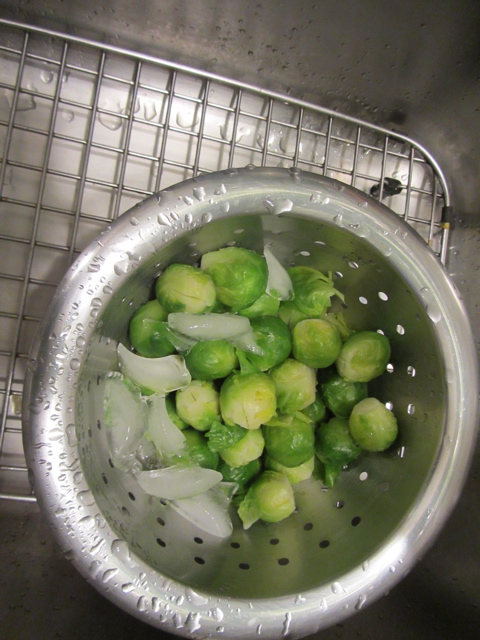 Cook the sprouts about 3-4 minutes until cooked but still firm and crunchy, drain and run in cold water…add some ice