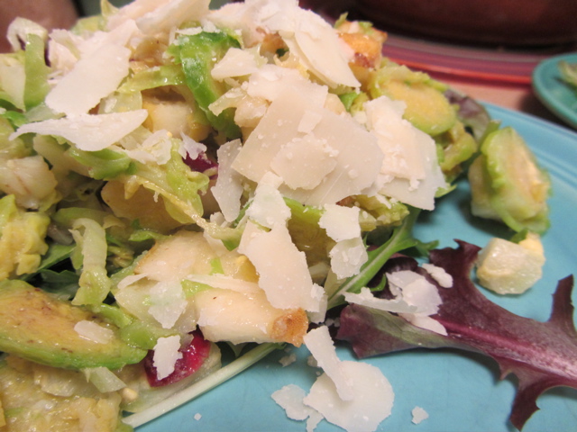 I ran into Sharon in Lifesource yesterday and she said she always likes recipes on the blog, so I thought I share what we had for dinner last night…a shaved Brussels Sprouts salad…YUM. I stole the recipe from Caffe Mingo in Portland and adapted it to our fridge and dietary needs…and I “mused” on sprouts a little as I cooked. We spent the year in England in 1979-80 and got truly addicted to Brussels sprouts (…good thing, as it was the only green vegetable available…) and then about March, they disappeared. The season was over. Of course here we can get them ALL the time, but I think the season is drawing to a close, so let’s eat some sprouts!