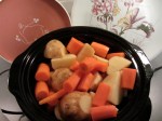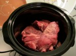 Pot roast (maybe about 3 pounds)…vegetables…packaged dry onion soup mix, combine and turn on cooker. It looks like this: