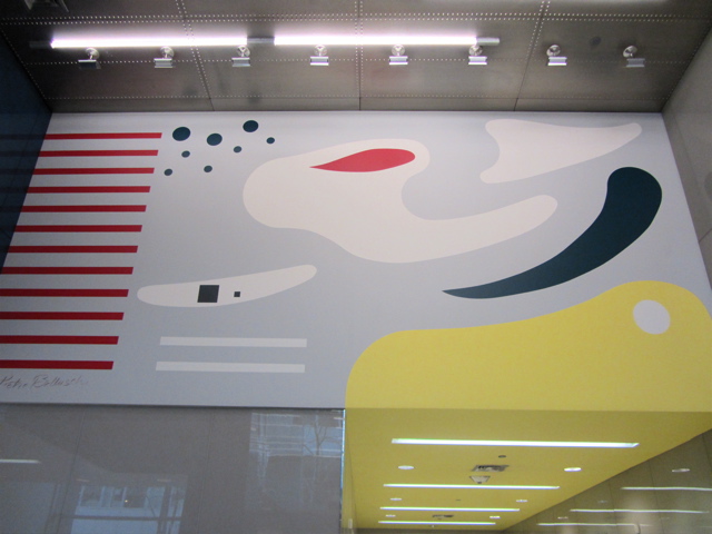 and here’s the reason why:  Belluschi wanted the lobby to have an Alexander Calder mobile, but the building owner at the time did not like abstraction, OR the price tag….$4000…so Belluschi designed this Calder-like mural and, using house paint and hiring house painters, decorated the lobby for a mere $50.  (I suspect the current building owners wish they had a Calder mobile in their lobby at this point!)
