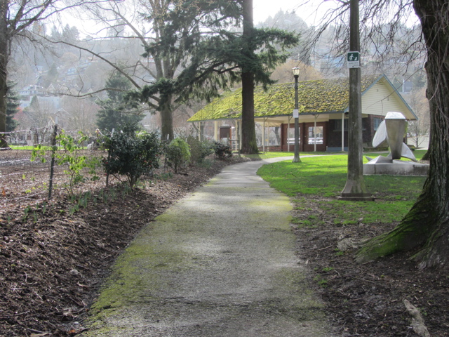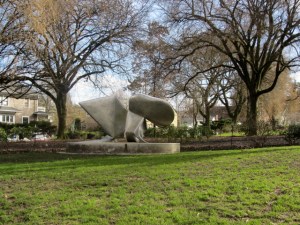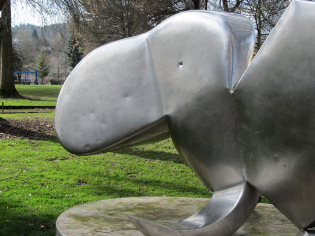 Keith told us another story about the Izquierdo sculpture “Silver Dawn” of 1980, which had been sited in Wallace Park (NW 25th and Raleigh).  Once on a grassy lawn, the parks department had made a dog run area around the sculpture, and the sculpture was being dented from the many thrown balls… until RACC relocated the sculpture in the park OUT of the dog area…