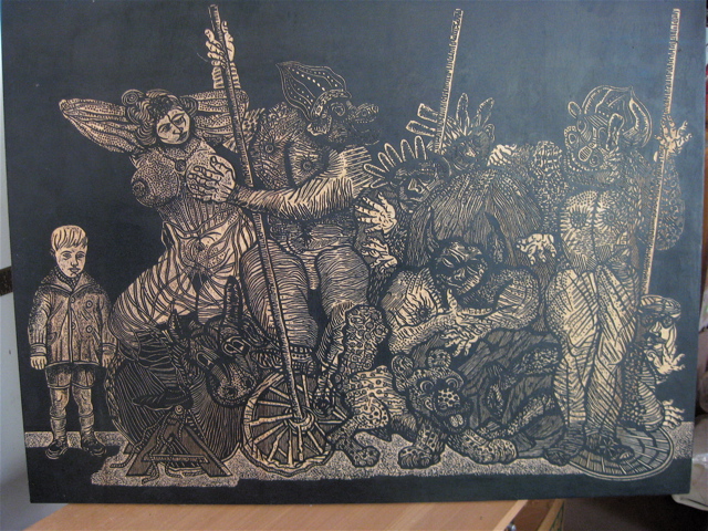wood blocks (the figure of a child on the left is Manuel himself and Jack McLarty peeks out on the right…):