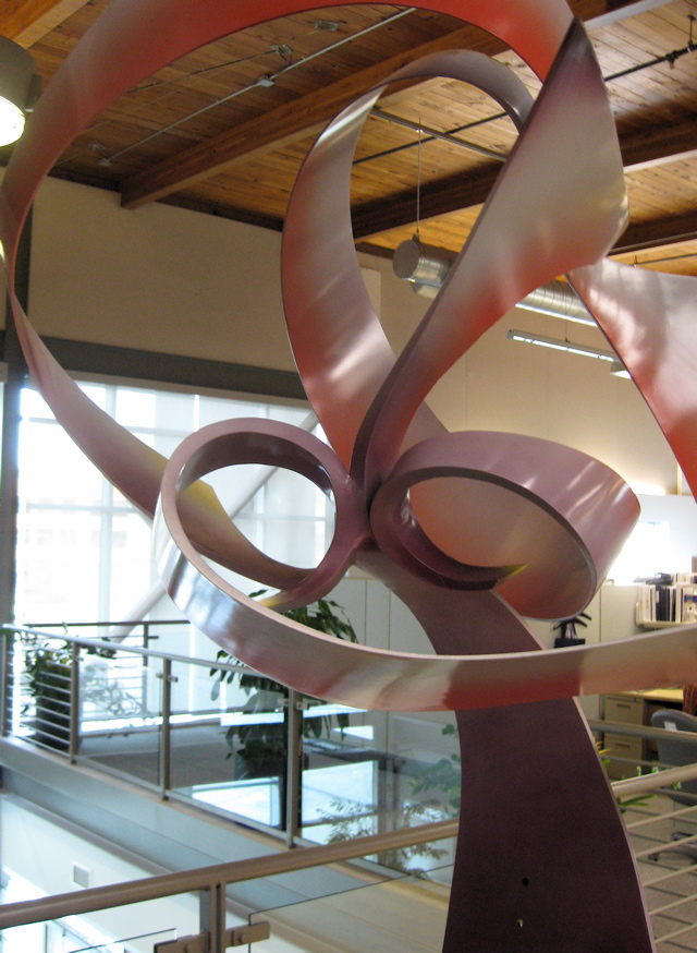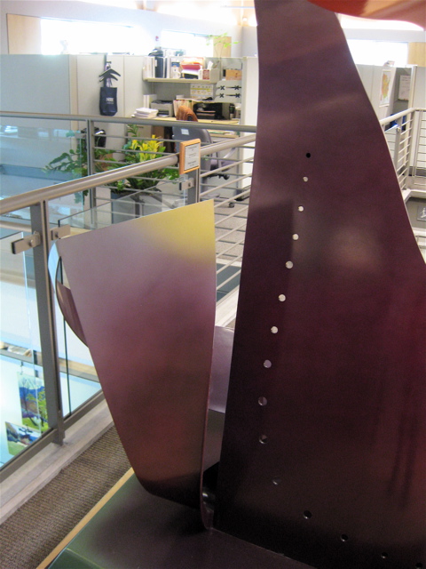 After saying goodbye to Sara, and getting directions to the ODS building in Milwaukie, R set off to find a piece alternately called “The Rose” and “Unfolding Rhythms.” Originally designed for the ODS Plaza at 5th and Stark, it had been moved inside in the new location, and was guarded by a somewhat fierce young woman who would not allow R access. Access was arranged, and “Unfolding Rhythms” duly photographed…