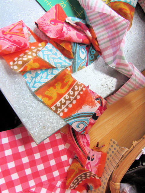I’m slowly turning the Indian skirt I got at Value village into a log cabin-ish quilt…it was a bunch of strips sewn together which I took apart…