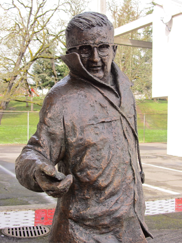 but we went not for park history, but to see Robert Hess’ sculpture of track coach Chuck Bowles…finally out of storage and in place at the finish line, where Bowles stood with stop watch in hand for 40+ years…