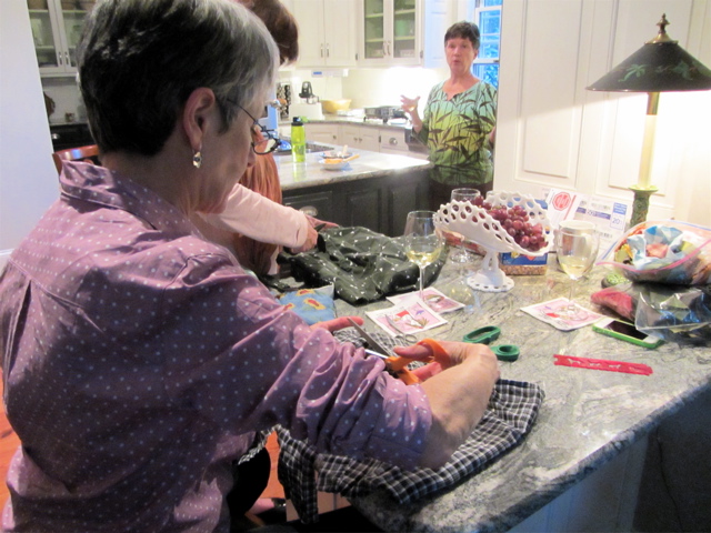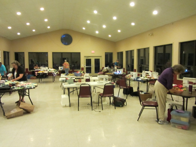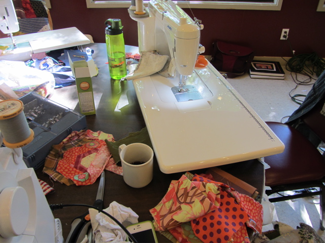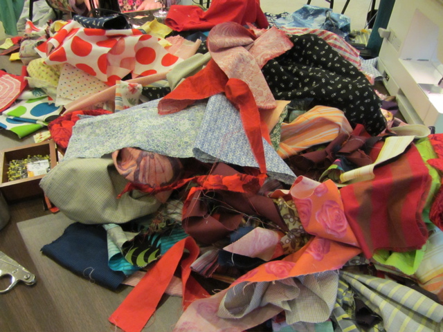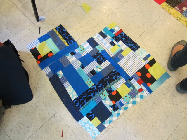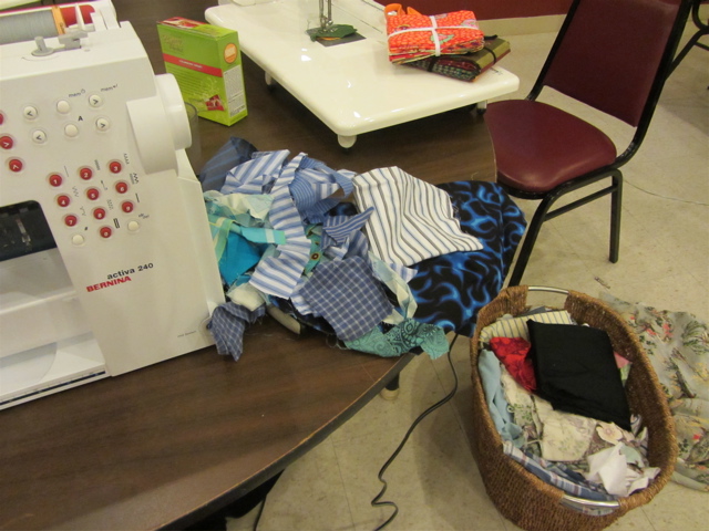 Machines get set up (thank you Mary), fabric comes out of bags, and we’re off and running…