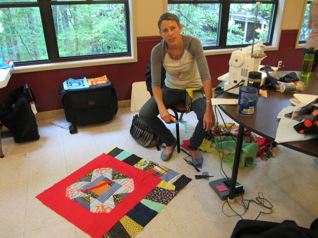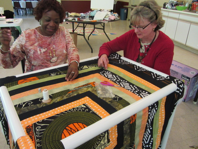 Of all the stories of those four days, one of the best is Cherrye’s. She is a school administrator in Birmingham from a long line of educated woman giving back to their community. She and her mother had agreed to make a quilt together, but her mother died suddenly. Cherrye decided to make the quilt to honor the promise BUT, the only thing she had ever sewn was a tote bag she made in high school. She arrived with her brand new sewing machine still in the box, and some fabric she bought on a recent trip to Ghana. Here is Cherrye on the left, and Kim on the right (note the sewing machine box under the table…) as she just is getting started…well you can’t drop a newby quilter into a group like this without a LOT of help being offered…