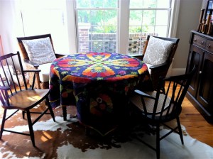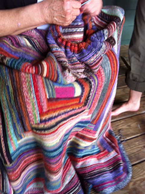 The first person I met was Dudley, who is really a knitter and was making this afghan with sock wool…and so the stories begin to roll…the yarn shop, on on…a part of what we’re sewing up, as it turns out…each others’ stories.