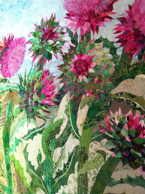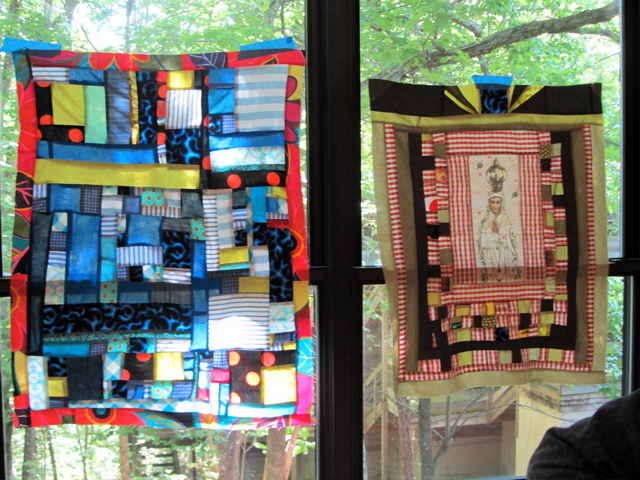 Mary worked with cut up clothing, new fabric and some vintage bark cloth, and added China’s suggestion of the dark green…