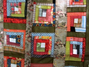 Tina’s Mom hovered over us too, as Tina worked hard to incorporate some fabric that her Mom had loved (the dark blue with white flowers.) Tina’s quilt for me had real resonance both in the squares and the sashing…
