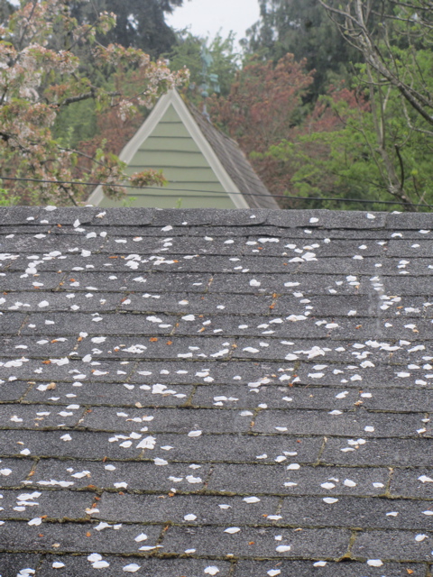 The day started without a flourish…just me noticing the apple tree petals on Gloria’s garage roof…