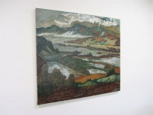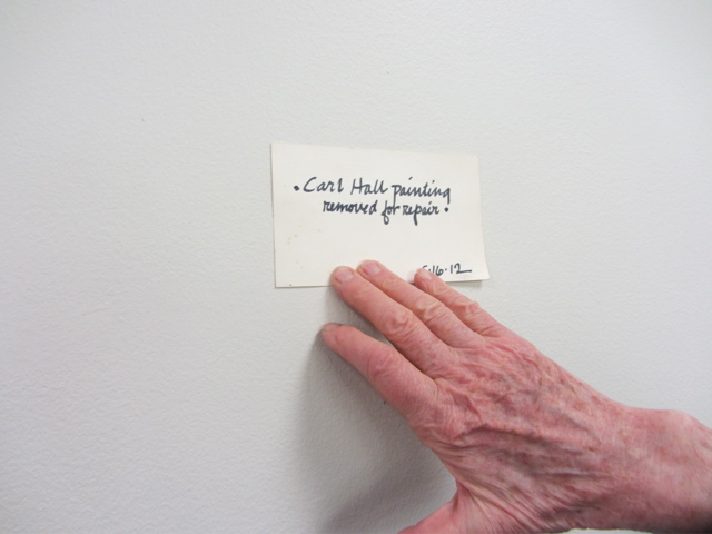 The Salem Public Library has in its collection a beautiful Carl Hall painting called “Flood” of 1948. It has had some definite conservation issues so Nancy and I agreed to take it to Portland to art conservator Nina Olsson. First we arrived at the library and removed the painting, posting a note on the wall…