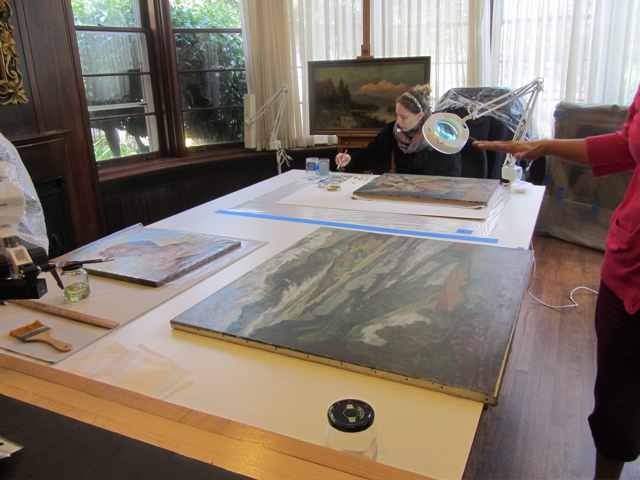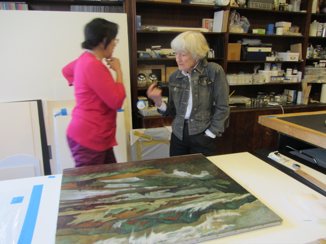 We brought the painting in to Nina’s studio and she and Nancy began examining the painting’s condition…