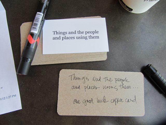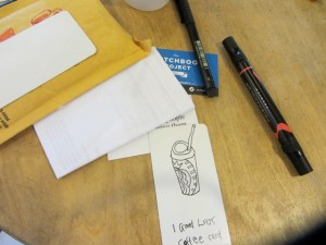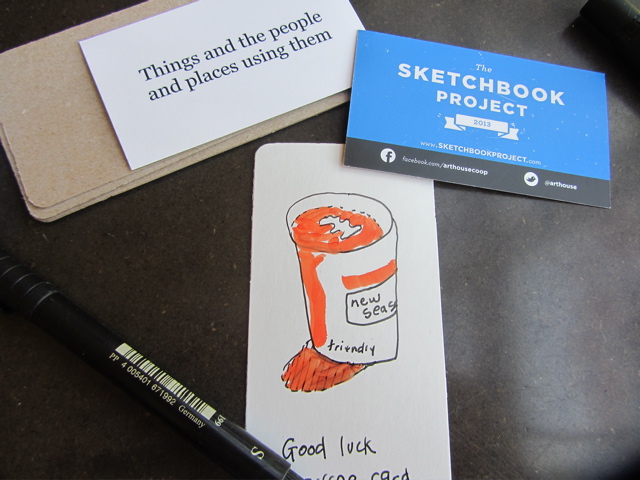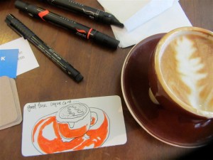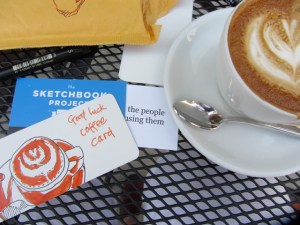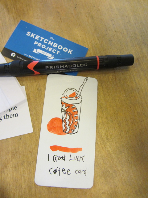 I would go to a coffee place, order a coffee and draw it, then leave the “good luck coffee card” for somebody to find…VOILA! I wrote my theme on the back of each card, and then added the http://www.sketchbookproject.com url…in case the finder wanted to check up on the project.