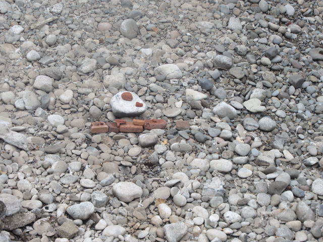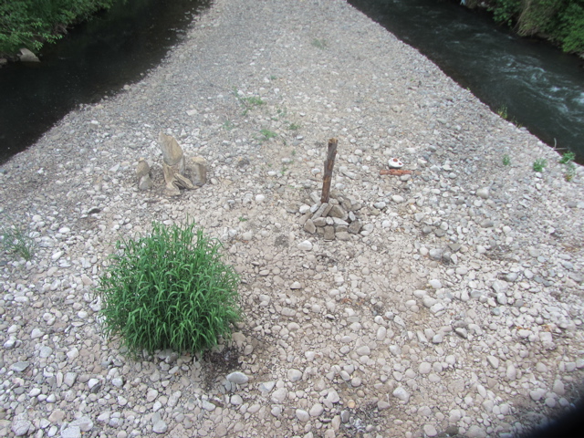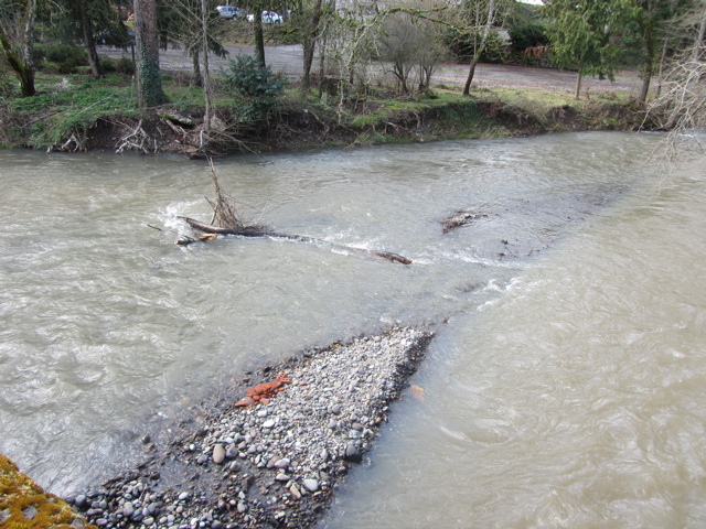 Thanks for sharing this fun surprise with others. We used to call this the gravel bar; Susan Miller thinks we should rename it the Art Bar. I asked nearby neighbor John VanDreal if he knew the mystery installer – no, he hadn’t even seen it. Thirty years ago we used to watch spawning salmon struggling upstream, by looking over this bridge, so I loved the symbolism of the salmon sculpture heading upsteam, but sadly, it lost its struggle too. I wish for the sculptor to know how much we appreciate his/her efforts – how do they navigate the deep channels?